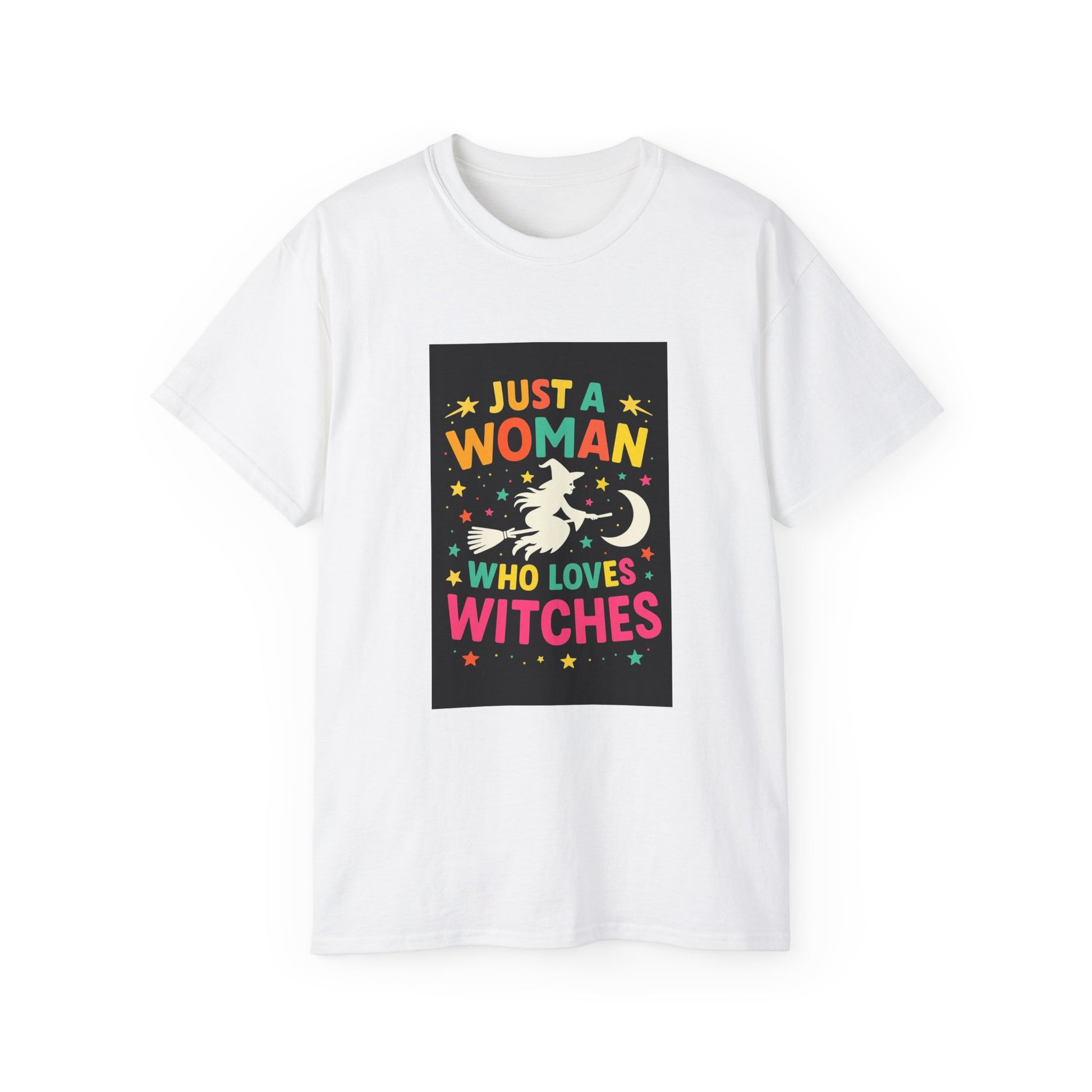 Just a Woman Who Loves Witches T-Shirt, Halloween Apparel, Witchy Gifts, Unisex Graphic Tee, Spooky Season Outfit, Women's Empowerment Shirt