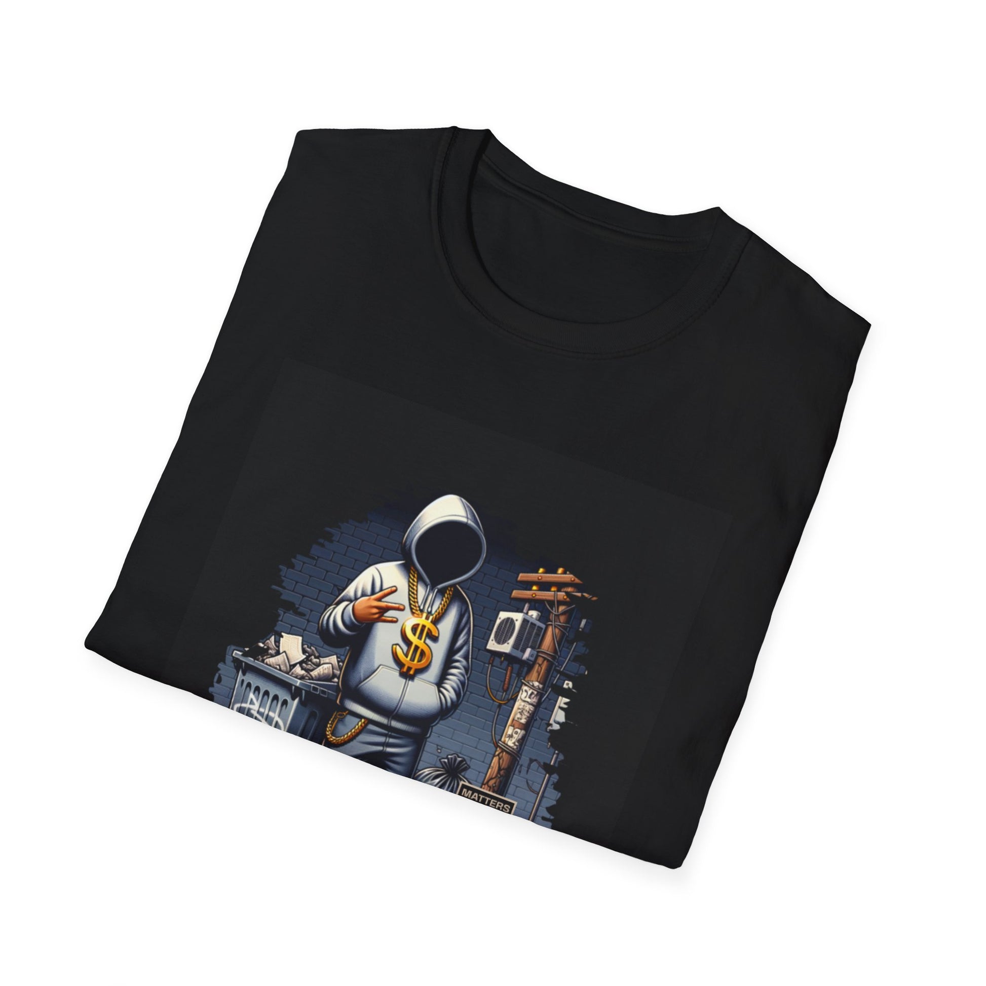 A soft, lightweight tee that wears like a lived-in favorite. The design centers on a hooded, anonymous figure in an urban night scene — neon-lit alleys, a worn trash can, and a bold emblem that reads MONEY — giving the shirt a gritty, streetwise mood. The fabric has a smooth, durable hand that prints beautifully, while the classic crew cut and clean silhouette make it easy to layer under a jacket or wear on its own. This tee settles into weekend routines, late-night city walks, studio sessions, and skate-park hangs — it feels like something that belongs to the night-shift dreamers and hustlers who value style with edge.