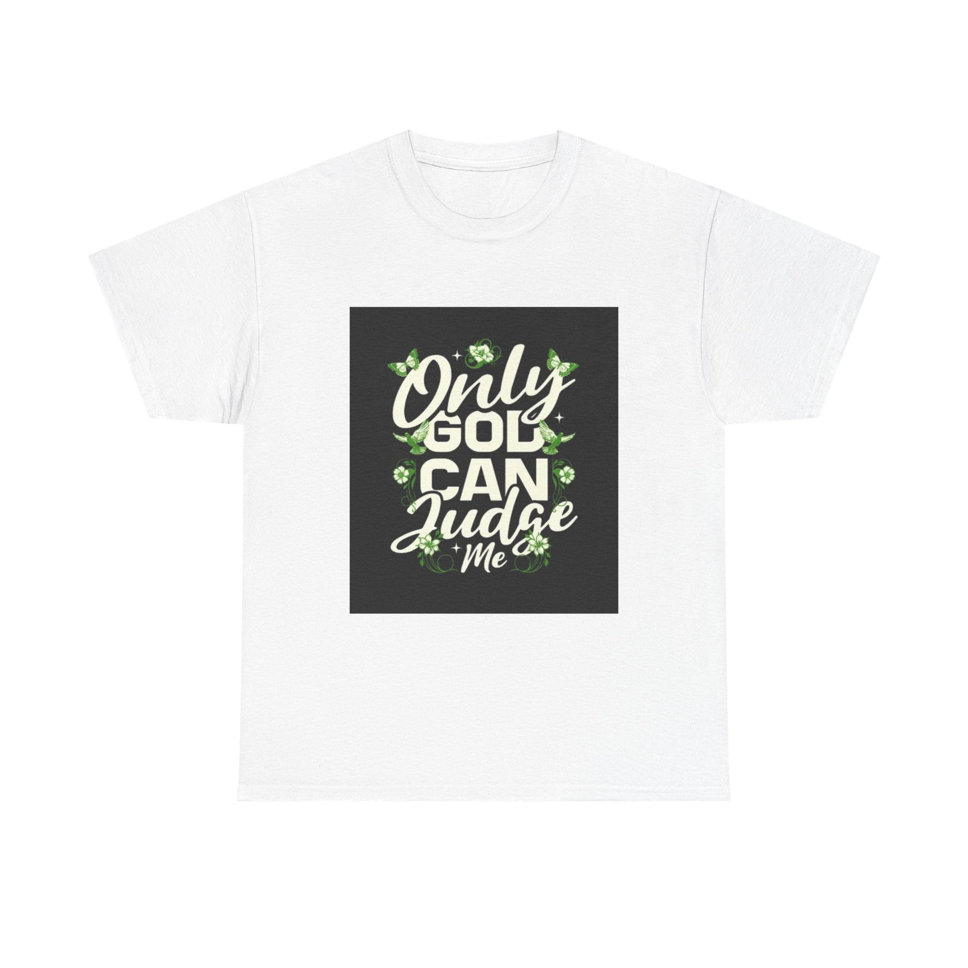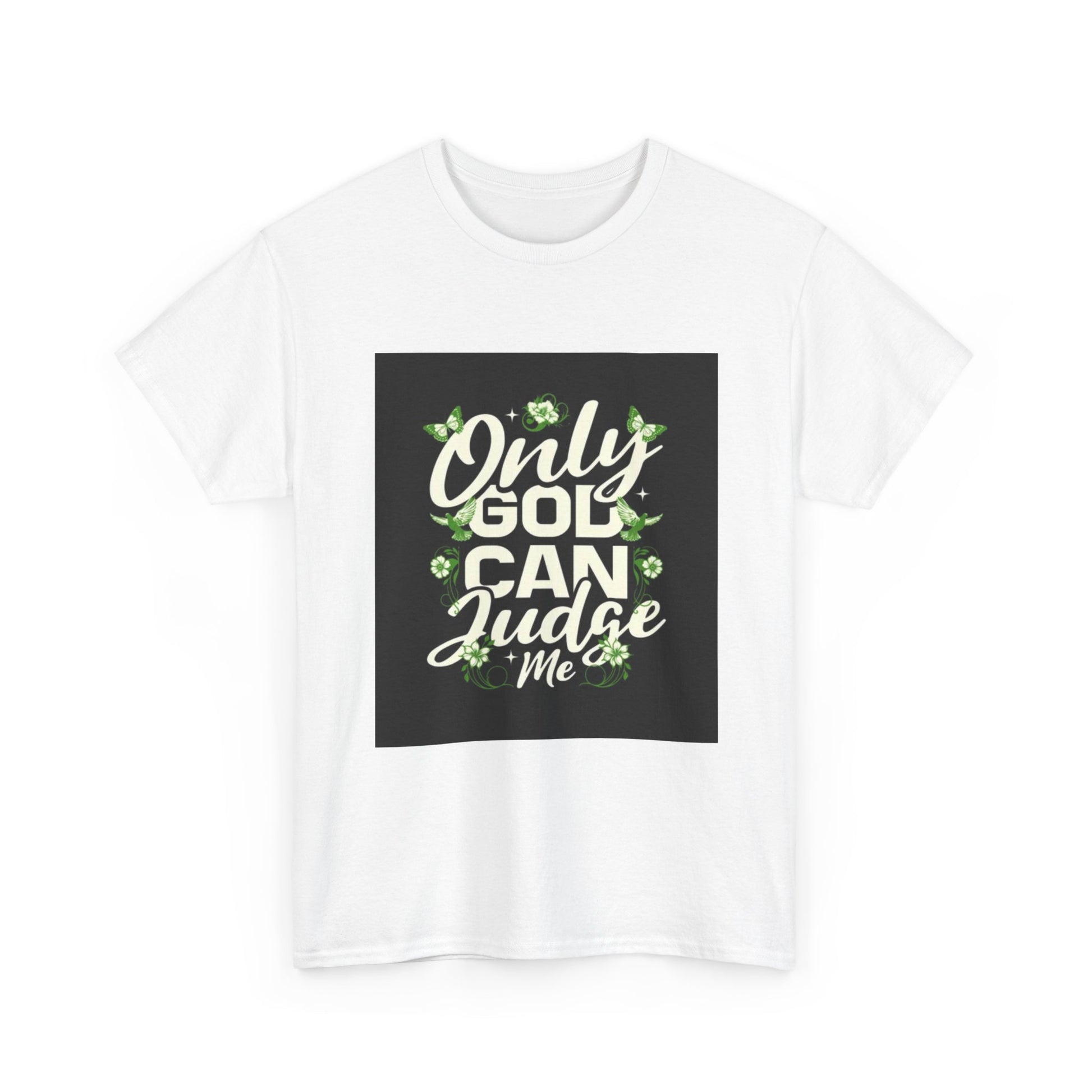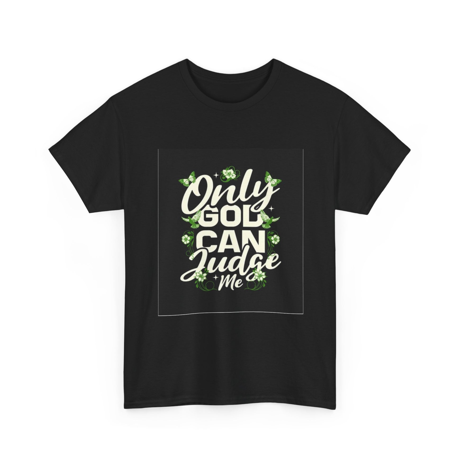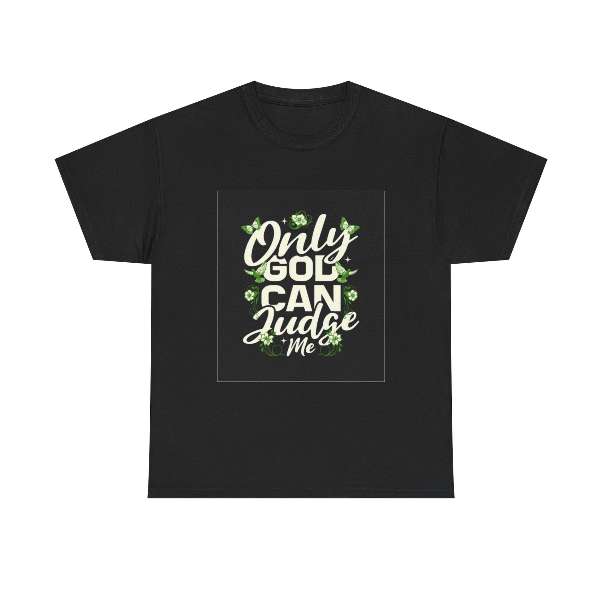 A soft, classic cotton tee printed with bold hand-lettering that reads “Only God Can Judge Me,” framed by delicate green floral accents. The relaxed crew-neck silhouette sits comfortably for everyday wear, while the sturdy midweight fabric holds print detail and shape through repeated wear. Wear it as a peaceful statement—layered under a jacket for city nights or paired with jeans on slow Sunday mornings. The message reads like a quiet boundary: gentle, confident, and quietly faith-forward.